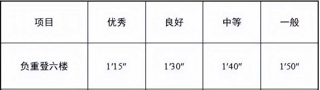 考核程序:考生佩戴消防头盔及消防安全腰带,手提两盘65毫米口径水带,从一楼楼梯口登至六楼楼梯口。记录时间。