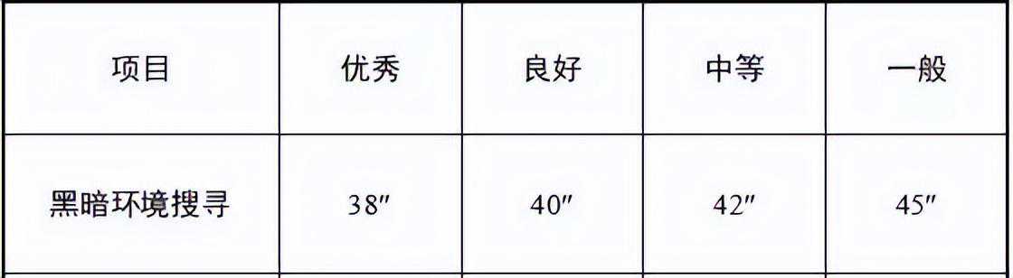 考核程序:考生穿着全套消防员防护装具,从长度为20米的封闭式L型通道一侧进入,以双手双膝匍匐前进的姿势从L型通道另一侧穿出。记录时间。