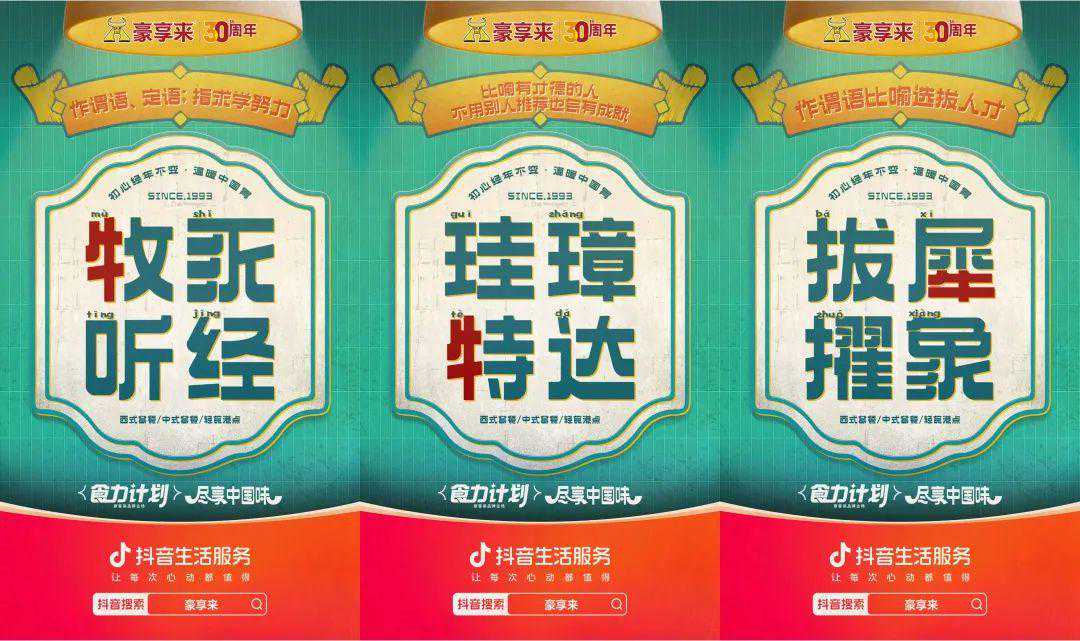 以「牛」入局,引用中国传统的四字古语,探究牛排的美味,追寻经典的强大。经典又惊艳·是传承的经典,是沉淀的惊艳。豪享来30年的努力经年不变,是儿时的记忆,是岁月的见证;豪享来30年的口口相传,是严格的标准、是备受青睐的选择、是豪享来30年的品质始终如一的精选。