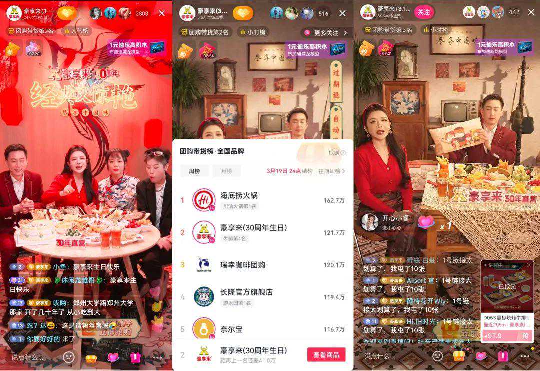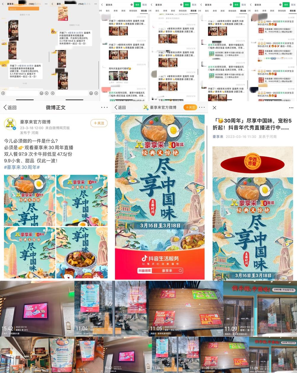 2023年3月,豪享来牛排携手抖音生活服务,聚焦热点与差异化营销,通过三十周年庆大节点,将“经典又惊艳|尽享中国味”主题融入定制化营销方案与传播方案,为全国范围提振声量奠定了良好的基础。结合抖音生活服务平台南区「食力计划」专项营销,为豪享来量身定做营销方案,从营销策略到传播规划到货品配置到直播活动,环环相扣,把握前期私域预热,圈定直播间自然客流,聚力线上线下推广,借势平台流量与势能,实现品牌开播首日破300万+,总GMV破700万+,曝光900万+,达成当周全国品牌团购榜第二,牛排第一的优秀战绩,并实现豪享来三十周庆话题热度突破1亿+,3月品牌整体交易GMV破3100万+。