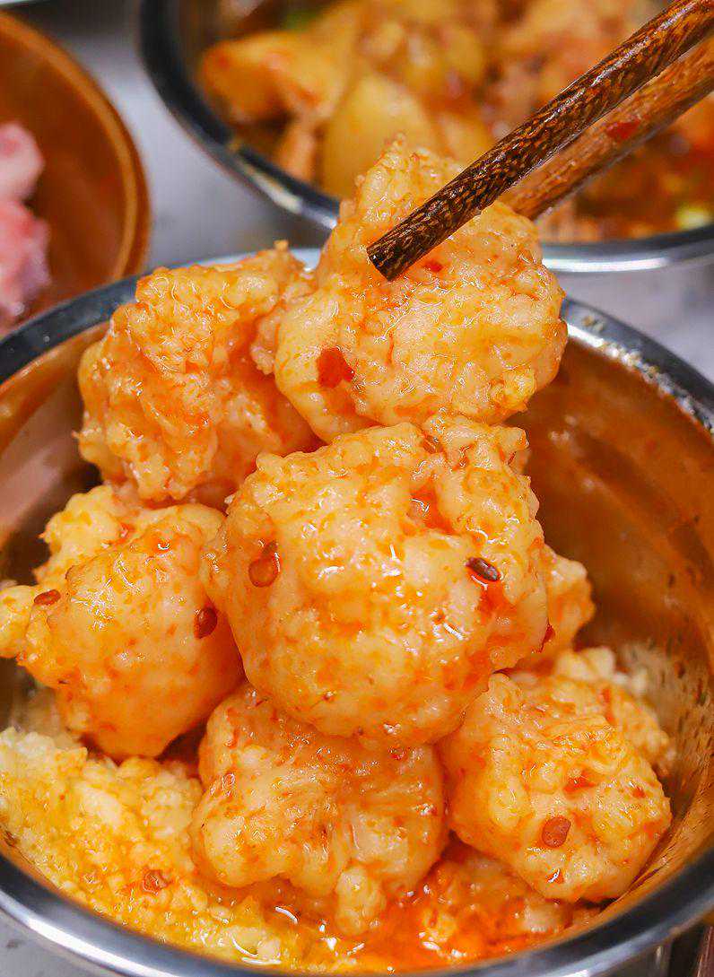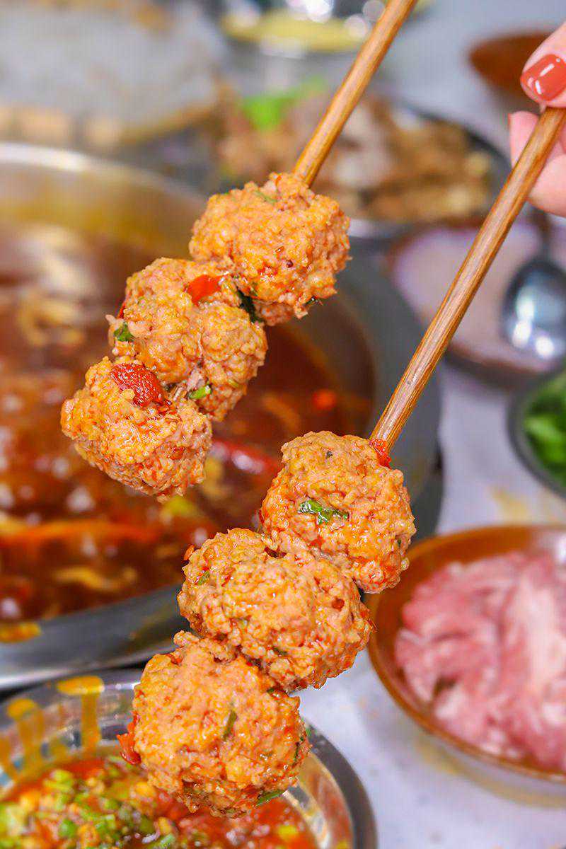 在红汤中涮过一圈的虾滑,裹上底料的鲜辣汤汁,肉质超Q超弹,筷功不好的可夹不住它哦!
