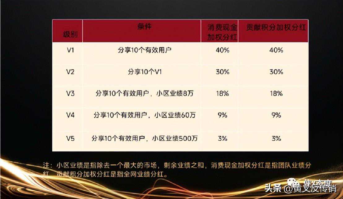 V5:参与者分享10个有效用户,团队小区业绩达到500万,即可晋升为V5,可享受3%的消费现金加权分红,以及3%的贡献积分加权分红。