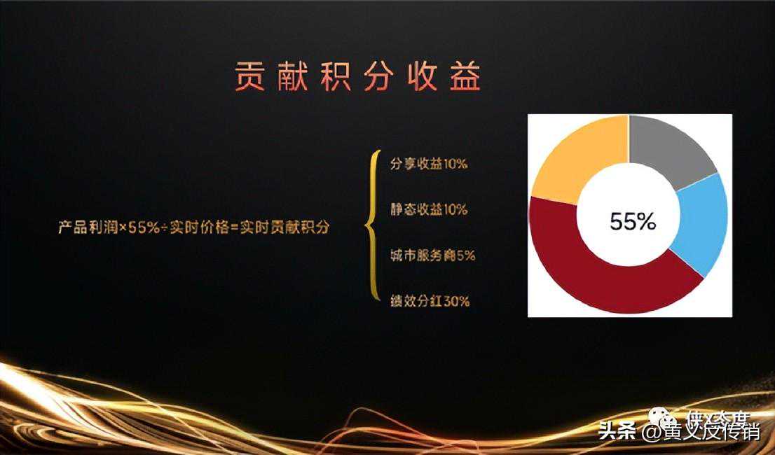V2:参与者分享10个V1用户,即可晋升为V2,可享受30%的消费现金加权分红,以及30%的贡献积分加权分红;