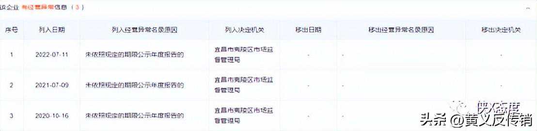经调查我们还发现,程行保担任监事的宜昌翔联网络科技有限公司存在经营异常情况,据爱企查显示,该公司成立于2016年5月27日,法定代表人为程行梅,监事程行保,该公司于2020年开始,连续三年被宜昌市夷陵区市场监督管理局列入经营异常名录,原因为未依照规定的期限公示年度报告,至今未被移除。