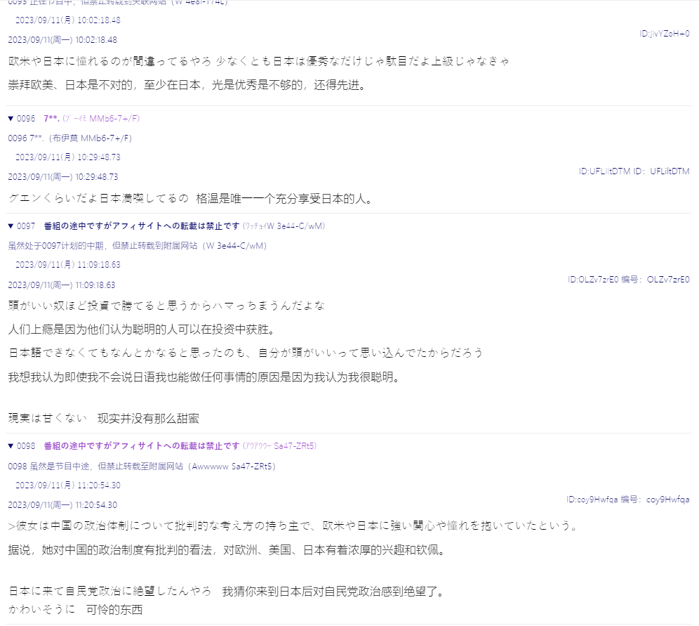 至少就5CH这篇网帖上诸多日本网民对王懿的评价来看,我可以负责任地说一句:没有。这其实也符合我往期内容中在提到王懿,还有王懿的同道中人时,时常会给他们套上的一个刻板印象:即无论是社会主义还是资本主义,极端利己主义者无论在哪儿都是不受人待见的。而逆向民族主义者们说白了,其实不也就是一群异化的极端利己主义者吗?