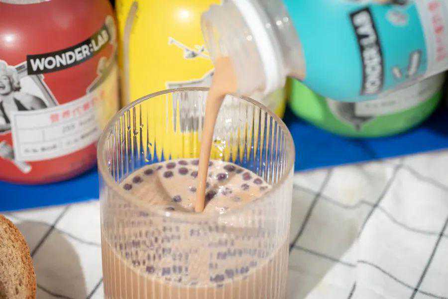 小胖瓶宣传的亮点是“还原奶茶级”口感。比起罐装代餐粉的中规中矩,它爱在粉剂里玩花样。加上圆圆的果仁、脆豆,冲开后扮演珍珠奶茶中“珍珠”的戏份。