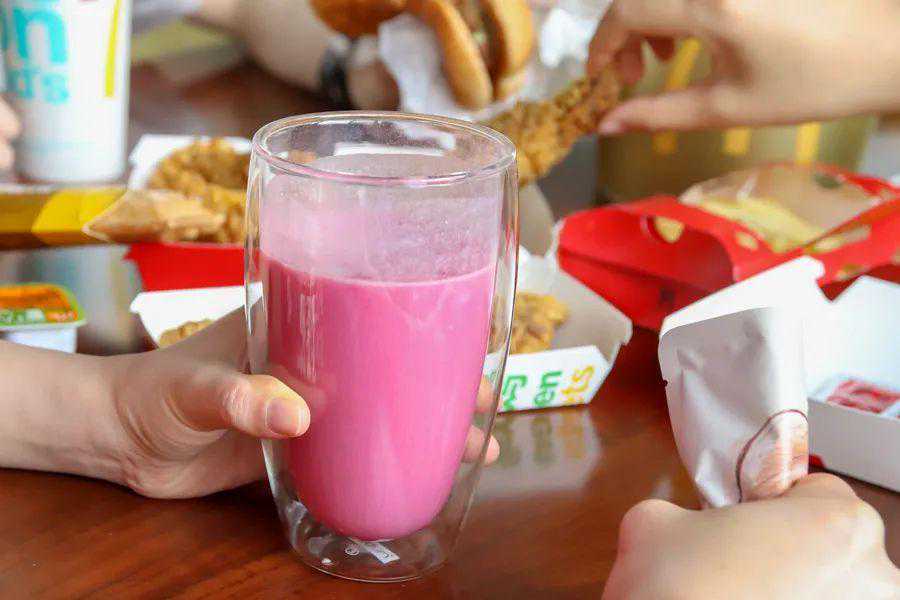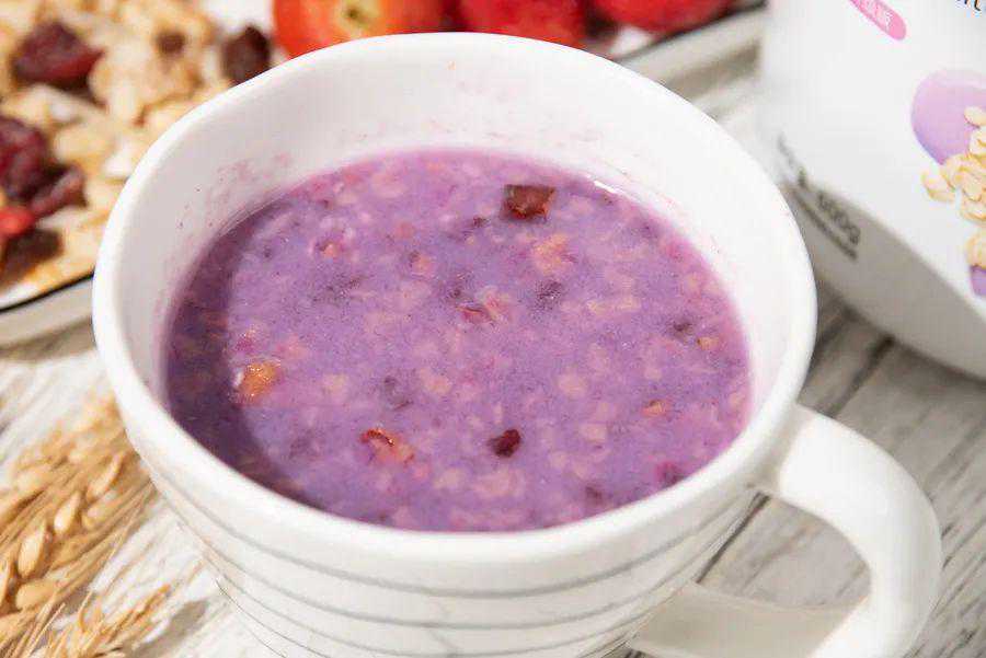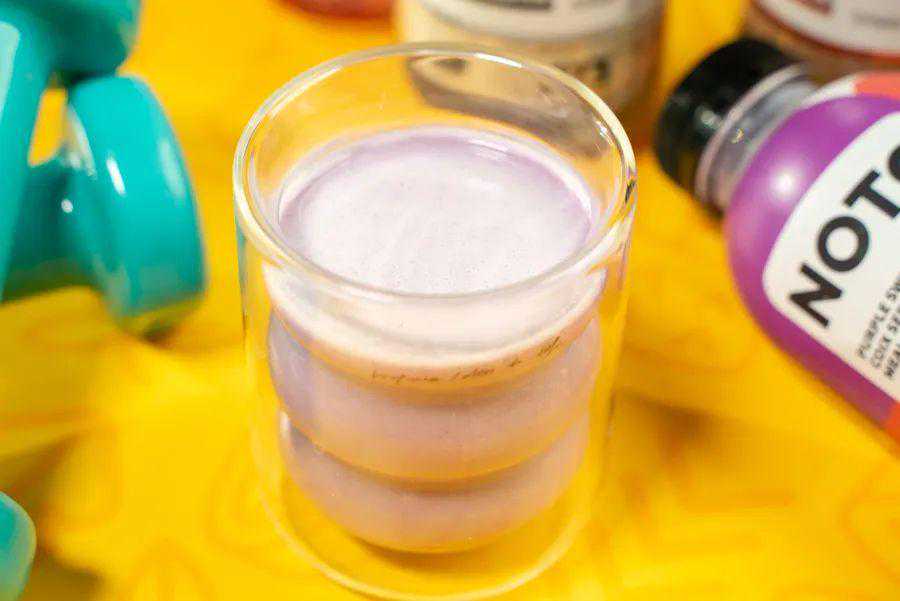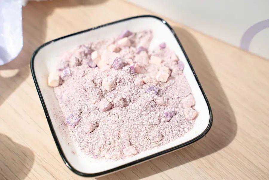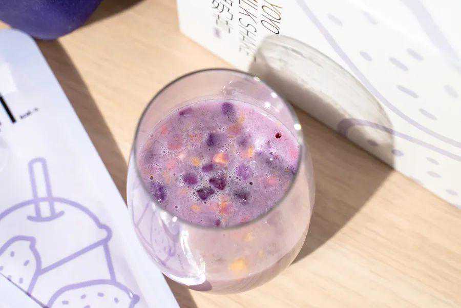 光是粉质的奶糊喝起来难免单调,紫薯这款添加了冻干草莓、木瓜和紫薯丁,不光能喝还能嚼到果肉,有趣又饱腹。