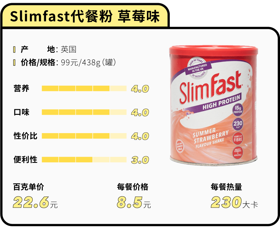 在一众上榜的进口代餐粉中,Slimfast代餐粉把性价比的王座坐得稳稳的,每餐不到9块钱。Slimfast在英国被奉为国民代餐,拥有44年的历史(哇~比局座岁数还大啦)。就连贝嫂和脱口秀女王奥普拉都是它的粉丝。