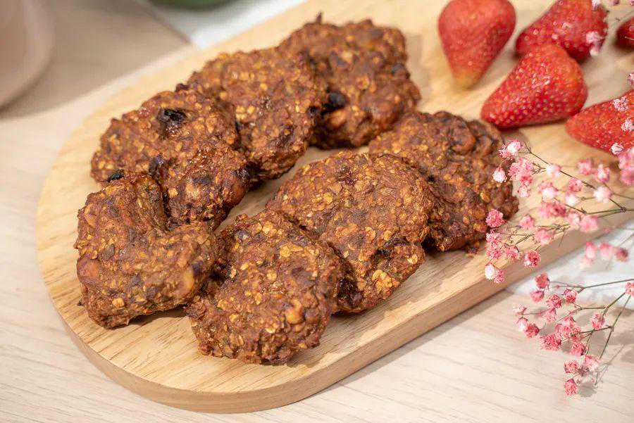 制作方法:香蕉压成泥,加燕麦、代餐粉、坚果、果干混合,捏成饼干装,烤箱200℃15-20分钟。