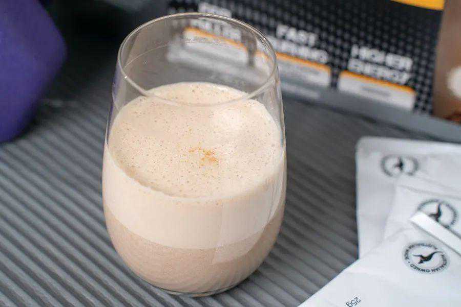 建议大家用带不锈钢球的蛋白摇摇杯冲泡,均匀摇晃开后带着一层蓬松的奶泡,有点奶泡咖啡的意思。在这里必须夸夸我的选味水平,摩卡咖啡味真的爆好喝,把咖啡味复刻得七七八八,还能饱腹,太赞了。