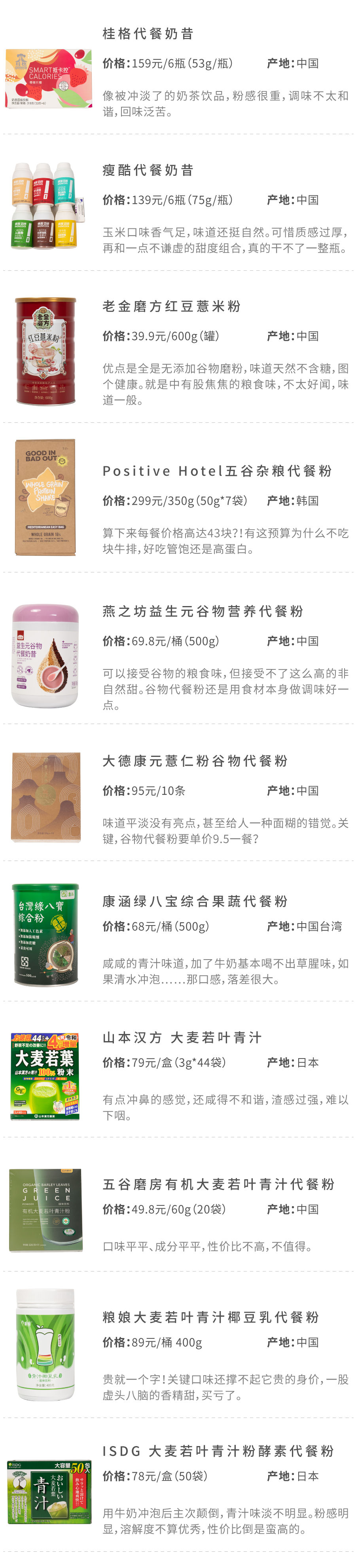 了解了代餐粉的类型和不同代餐粉的特点及优势后,在综合比较各类型代餐粉的味道、性价比和营养成分后,以下是我交给局座和大家的作业。朋友们按需对号、挑好再买、结合自身情况适量食用。