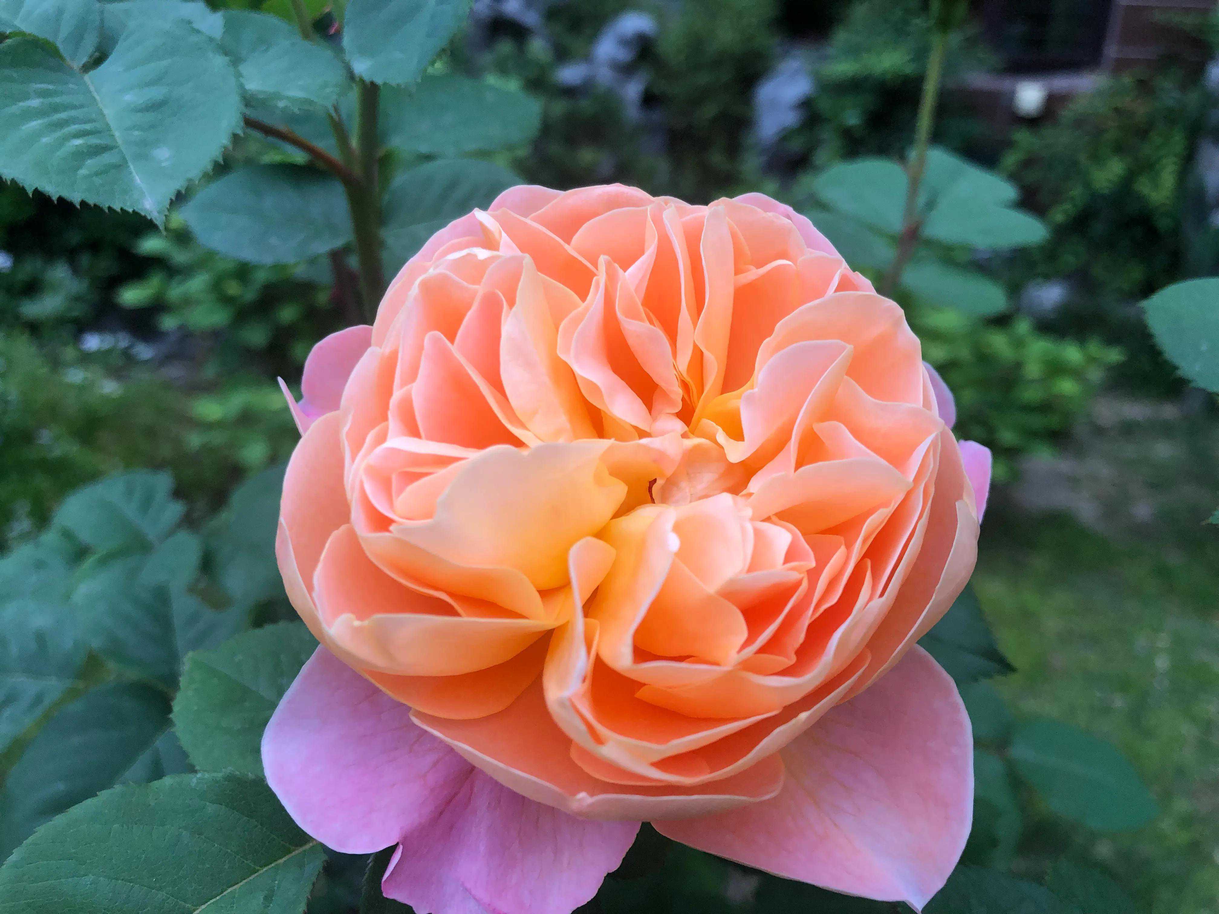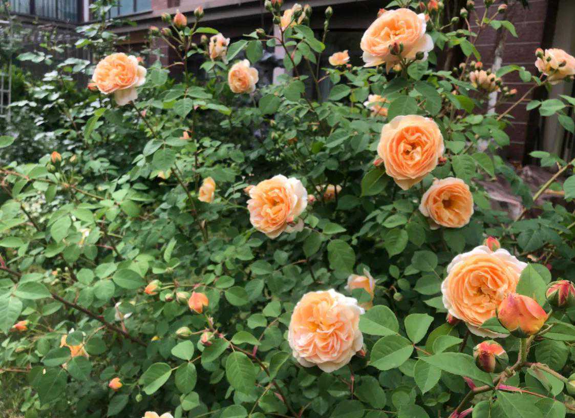 半橙半黄色的欢笑格鲁吉亚是我的第一棵月季,最早种在花盆里。早春枝叶茂盛,每一根枝条上都有三四个小花苞,舍不得掐花苞,四月,枝头上开满了花朵,花朵盛开时枝条儿都弯下来了,漂亮是真的,但枝条有点承受不住心疼也是真的,真怕枝条给折断了。第二年挖出来地栽,欢笑格鲁吉亚犹如开挂了一般,整一棵主枝条粗壮,爆出了无数的分枝,枝条交错野蛮生长着,株型特别高大有气势。这个春天,满院子都是欢笑格鲁吉亚的淡黄色和柠檬花香,惹得院子外面的人都在啧啧赞叹,多么漂亮的月季呀!