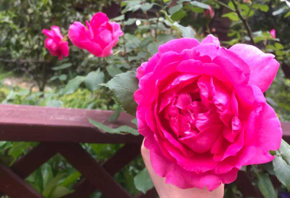 粉龙、红龙、大游行害羞地爬在围栏上,很想打造盛世花海,想拥有一面花墙。可惜,几年来粉龙、红龙、大游行都开得很旺,单朵花也很大,每一枝上花骨朵比较密,但是就聚在一起不扩大它们的领地,还是只一小片,形不成气候。也许与自己的种植技术太菜有关系,理想总是很丰满,现实却一年一年很骨干。为此,也总在学习的路上,孜孜不倦,且种且学,只待花开花盛花墙来。