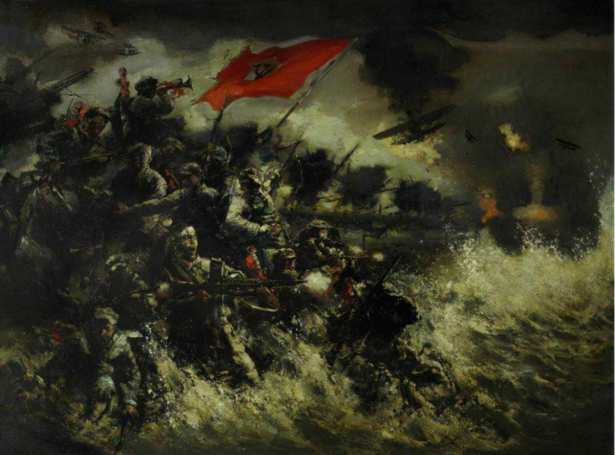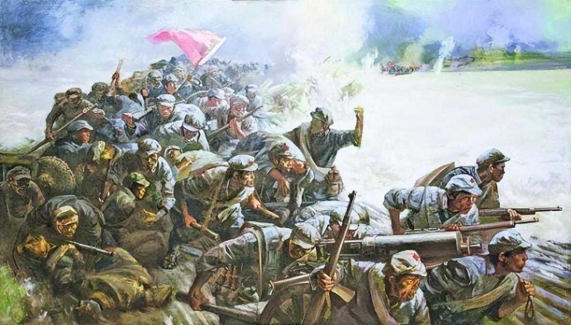 岸上的国民党守军见红军准备强行渡江,立刻发起攻击,然而渡江之心已决的红军战士们丝毫不惧,在枪林弹雨中奋勇前进。