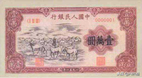 第一套人民币币王的壹万圆“牧马图”被誉为“中国人民币之宝”和“票王”,更成为了人们可望而不可即的追求。据悉,该币仅仅在市场上流通了3年11个月,而且距离现在时间久远,保存困难,而且根据资料显示,壹万圆牧马图票券正式流通票所见有记录64张,未见有全品新相,九成以上据告不过五张。因此,这一万元牧马的价值可见一斑。