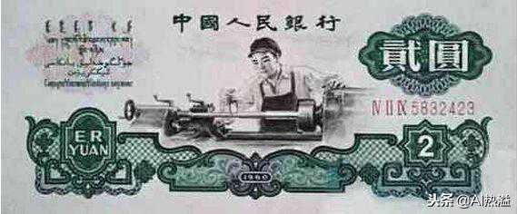 第三套人民币贰元券,该币1960年制版,1964年4月15日发行,1991年3月1日只收不付,2001年7月1日停止流通。正面图景是车床工人,颜色为深绿色,反面为浅绿色。该币在第三套人民币中是最早发行的,是第三套人民币最有价值的种类之一,在某种程度上引领了钱币市场。