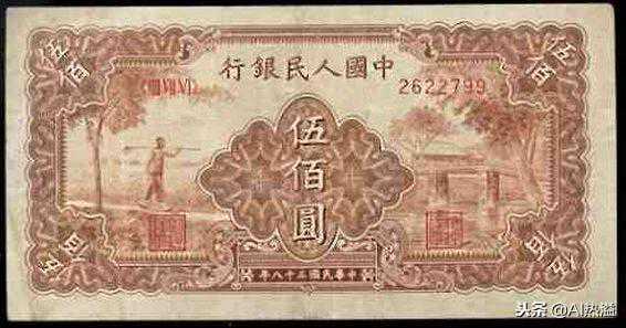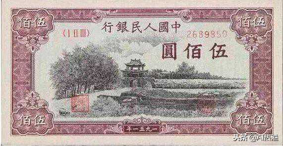 第二套人民币伍佰元券,该币1953年制版,由前苏联印刷并于1955年3月1日发行,期间因为苏中关系发生变化,1964年5月15日就被迫停止收兑立即退出流通领域。该纸币正反两面都是以深绿色为主色,正面图景是革命根据地井冈山。在收藏领域,此纸币一直表现出稳定的增长趋势,价格始终保持向上增长的势头。