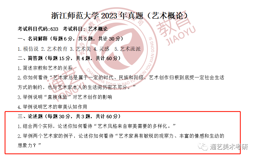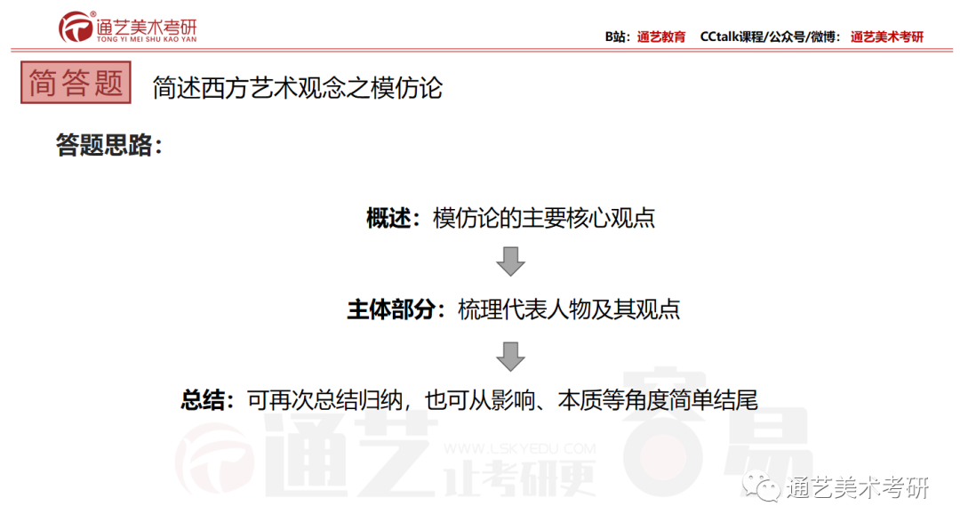 艺术概论和中外美术相比还是稍微有点区别,在论述题的写作上会更加看重逻辑性和例证分析的准确性,具体的写题技巧由于字数的限制无法在此赘述,但网络上和咱们的课程里干货都是非常多的。通艺的《艺术概论》冲刺课便是为论述题量身定做的课程,汇集了大量院校的经典论述题真题,分析范文写作思路、论据分析角度、文章整体结构等等,让大家对于艺术概论的学习再上一个台阶。毕竟咱们考研最终还是为了十二月底的那场考试,不能光学和背,一定要不断写题,写题实际上也是背诵和理解的过程!