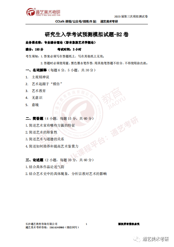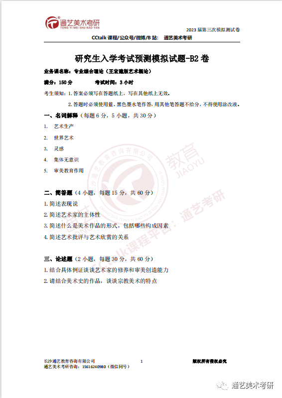 最后一步,离我们考试只差一个月了!我们只需要不断查漏补缺,定期进行套卷的模拟测试,就可以真正进入考试的状态!艺术概论一般分为单独一门科目考试以及和中外美术史一起合为一门科目考试。前期大家多半以以单道题为练习的方式,这一阶段就可以开始领略3小时做一套完整测试卷的酸爽了。当然,刚开始做套卷的时候,很多同学都写不完,但其实这是很宝贵的经验,你可以复盘自己哪一种题型用时过长,然后合理规划下一次的模拟测试,直到3小时内可以完成所有的题目!这一阶段,通艺也将为内部学员安排好模拟测试,并进行一对一批阅,大家积极参与即可。