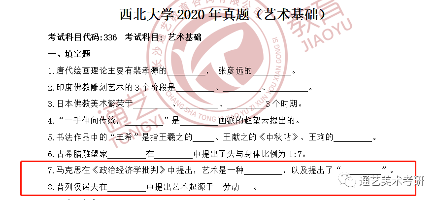 分值通常在2-3分之间,这类型的考题尤为喜欢考书本上的细节,常考理论著作的作者(比如《原始文化》的作者是____)、书上分析过的著名作品的作者(比如《韩熙载夜宴图》出自于___之手)、微观知识点(比如书法的主要书体为__)或者是常见知识点(比如艺术创作过程中的中心环节是__)。有选择填空题的同学需要对一些看上去不是重难点的细碎知识稍加整理。