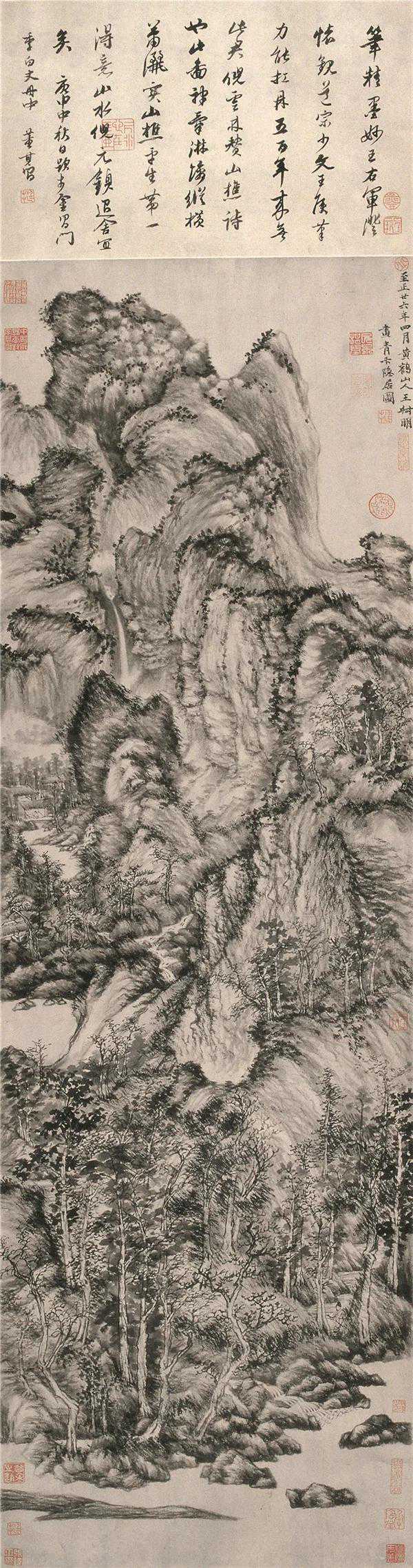 《青卞隐居图》深得苍郁繁茂,浑厚华滋的气象。王蒙强调以书入画,以篆籀笔法写解索皴。倪瓒评他;“王侯笔力能扛鼎,五百年来无此君。”龚半千论“北宋人千丘万壑,无一笔不简,元人枯枝瘦石,无一笔不繁”,此一简一繁,亦可移论王蒙之浑茫繁密,云林之萧散简远。