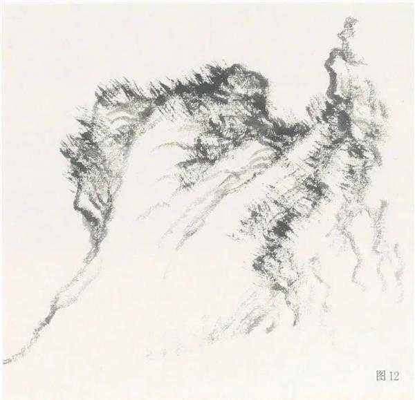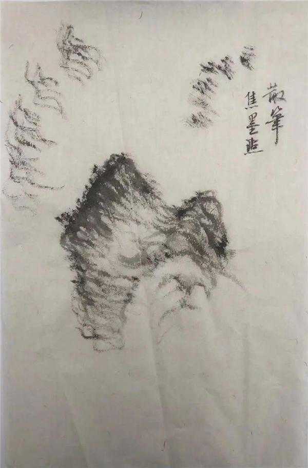 这块山石属披麻破,所以运笔多带平行,但不可绝对。执笔要松、行笔要松,体会毛笔在纸上时顶住纸面欲入又不全入的感觉。披麻破三五成组,笔致与形体的凸凹相联系,凹处簸笔宜多而浓,凸处宜淡而少,笔线之间宜少交叉,要有条理,可边皴边擦连续出之。