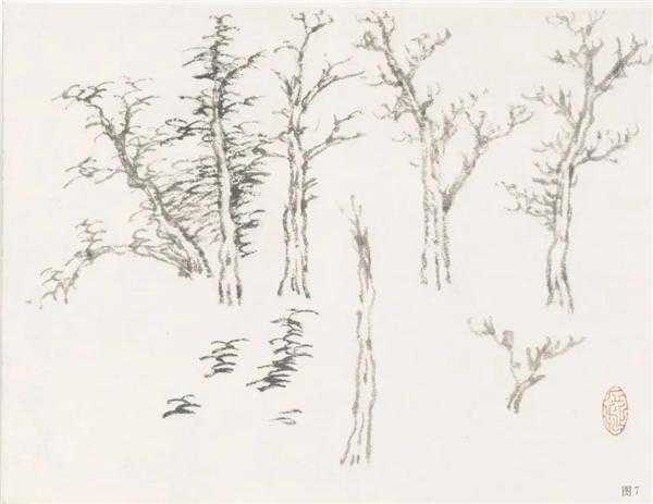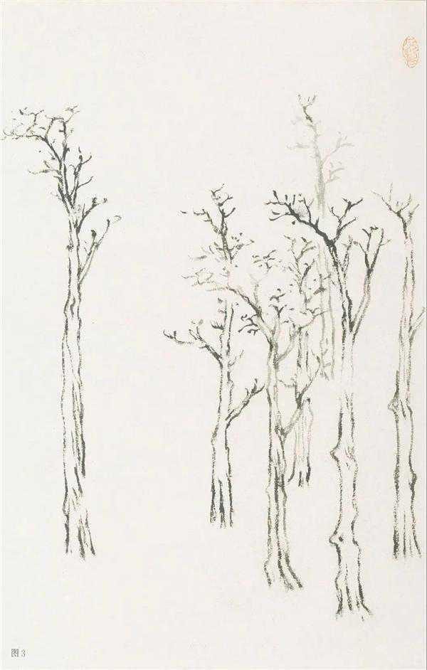 渴笔点:全用焦墨点之,画时可在另纸将笔调整好,笔锋散开,看准应点的地方,集中精力,以腕重击桌面有声从容落下,笔头猛着画面,层层而上,要注意点与树干碰离关系。