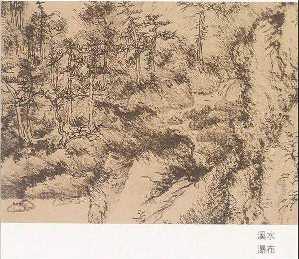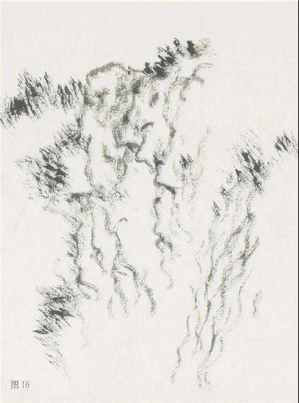 枯笔牛毛皴,画时自右而左,用曲屈笔线紧排旋转而出之,带篆隶笔意,笔线较短,干后用淡而润的皴笔复加,四五遍而成,亦是以渴成润法,第一遍当出效果。牛毛皴多与解索皴夹用,较少单独成幅。