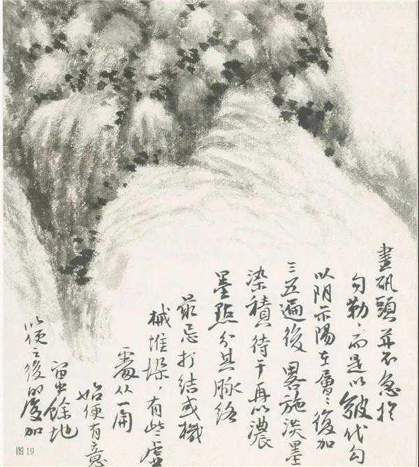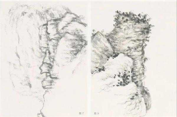 勾、皴、擦、染,有时也交互进行。勾勒宜用含水较少的笔头,用笔要有变化,随山石形体的走势来行笔。要有顿挫、转折的笔意。笔与笔要有碰有让。此图画法基本上是勾皴并举,边勾边皴边擦,皴笔则由石块的阴面皴起。勾皴石头注意不要笔笔勾死,不能太实(易板刻),也不要太虚,(不见骨力),注意山石的大小、疏密相间。另,转折处忌妄生圭角。