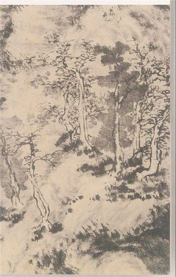 画中近景树林基本是由各种点叶树组成,关系较复杂、疏密有致,大体上树直者用横点、圆点;欹侧者用散锋渴笔点、枯树则矫然于林外,左右盼顾,若即若离。丛树整立而近边树则较翩跹。