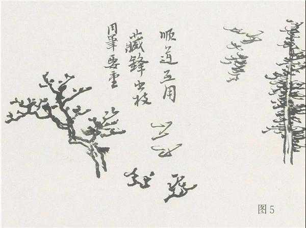 3、当中两棵点叶树用大混点。注意笔蘸墨要考究——笔嘴墨较浓重,笔肚则淡些,笔根几乎是清水,下笔时笔尖向外,卧笔横取,在纸上稍作停留(笔与纸面大约呈40度),其墨韵的微妙变化是通过毛笔的运用及其落墨过程的浓淡相破而产生的。另,点叶树中的一些出枝,也不能马虎,只有这些出枝到位,所点的叶子才能嵌准结构。