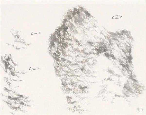 画解索皴尤贵笔意,下笔要沉着痛快,藏锋入笔,寓刚于柔,笔笔送到,忌浮滑。画时要注意笔线之间的组合关系,不要太规则,成“8”字形,要根据山脉的结构,一组一组地生发,尤贵画得“毛”“松”。