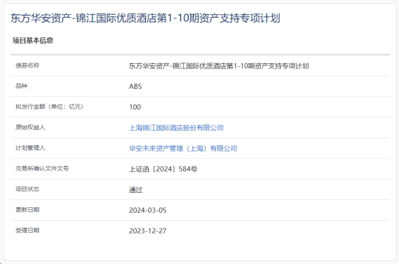 据了解,东方华安资产-锦江国际优质酒店第1期资产支持专项计划源自资产支持证券-ABS东方华安资产-锦江国际优质酒店第1-10期资产支持专项计划,该项目拟发行金额为100亿元,华安未来资产管理(上海)有限公司为计划管理人,锦江酒店为原始权益人,于2024年3月5日获得通过。