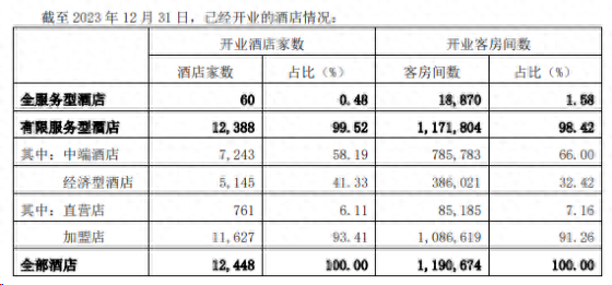 在营酒店数量上,锦江酒店2023年新增开业酒店1407家,开业退出酒店518家,开业转筹建酒店1家,净增开业酒店888家。其中全服务型酒店新增60家,有限服务型酒店新开业1347家,开业退出酒店518家,开业转筹建酒店1家,净增开业酒店828家。有限服务型酒店中直营酒店减少75家,加盟酒店增加903家。截至2023年末,锦江酒店已经开业的酒店合计为12448家,已经开业的酒店客房总数达到119万间。