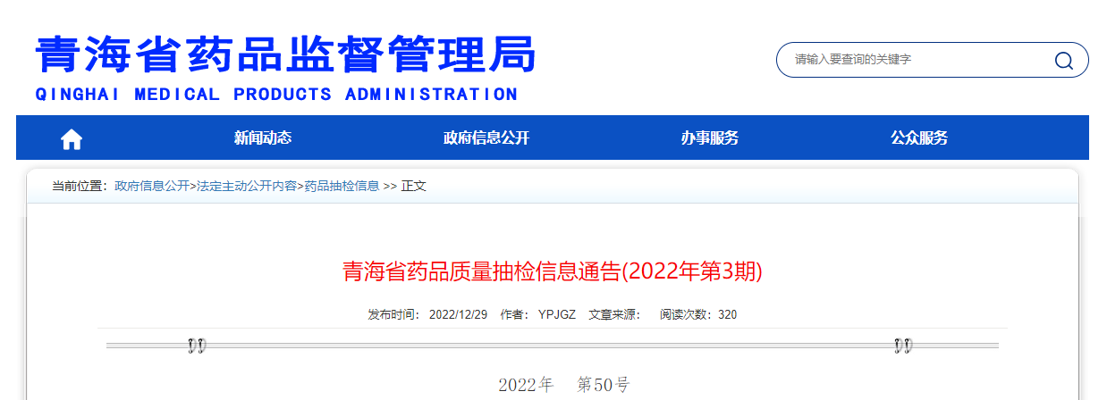 中2022年12月29日,青海省药品监督管理局网站发布药品质量抽检信息通告(2022年第3期)。本期全省共抽查检验161批次药品。经核查确认,161批次均符合药品标准规定。