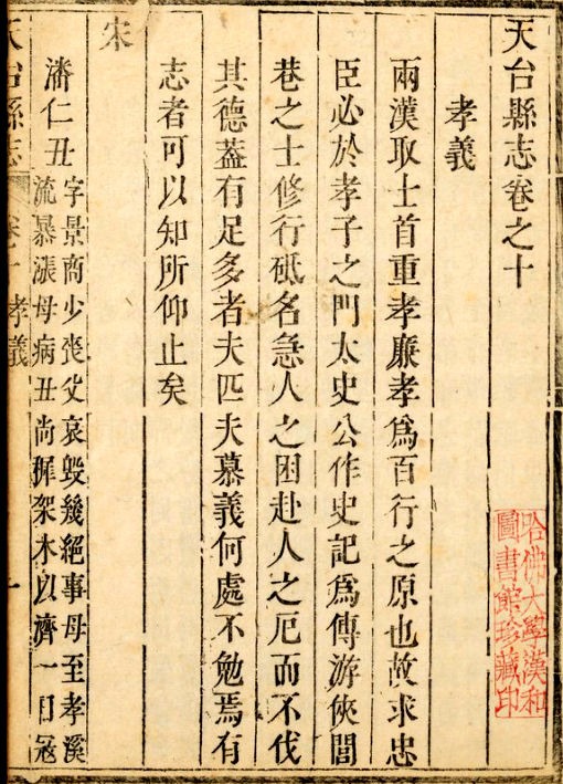 天台县志卷之十人物志下孝义、隐逸、醇德、耆善、贞烈、寓贤、方技孝义两汉取士,首重孝廉,孝为百行之原也。故求忠臣,必于孝子之门。太史公作《史记》,为传游侠闾巷之士,修行砥名、急人之困、赴人之厄,而不伐其......