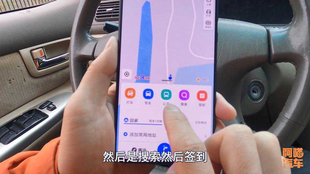 同样打开百度地图,最便捷的首先也是打车,接着是驾车、公交、搜索、签到,打车作为一个很重要的因素植入进来。