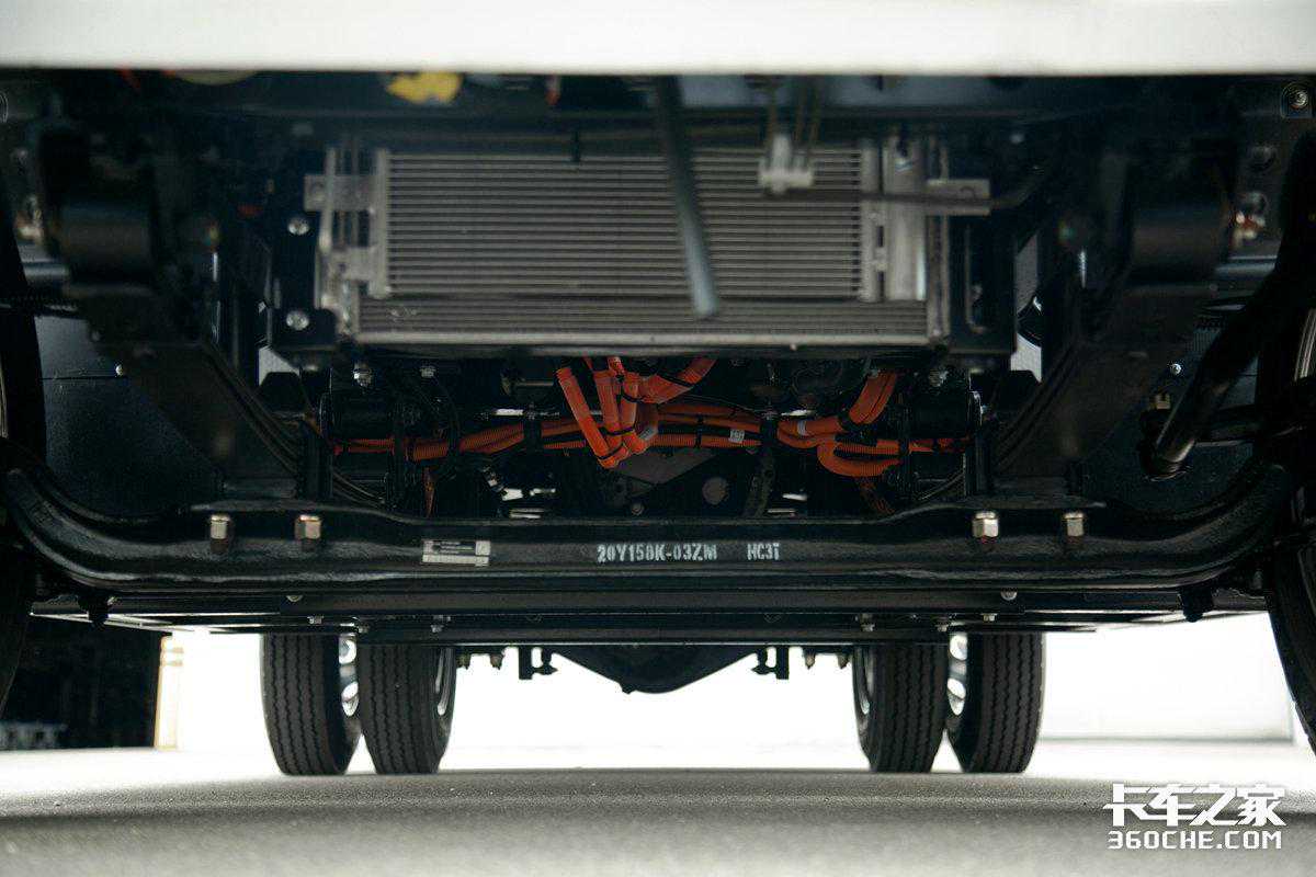 对于电车而言,最为重要的就是三电系统,其中实拍的泓图EV车型采用了宁德时代磷酸铁锂的双电池组,分别布局在底盘两侧,电池容量为115kWh。这样的容量在此前的新能源轻卡中几乎未曾见过,这也让泓图EV在40km/h等速法工况下的续航能力达到了575km,而在标载状态下可以轻松达到310-330km左右的续航里程。