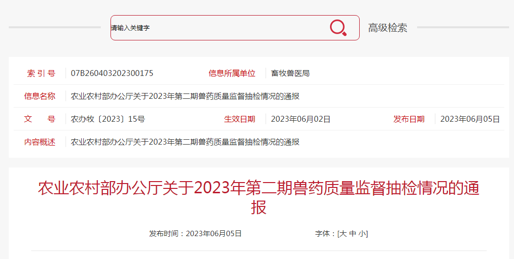 农业农村部办公厅关于2023年第二期兽药质量监督抽检情况的通报