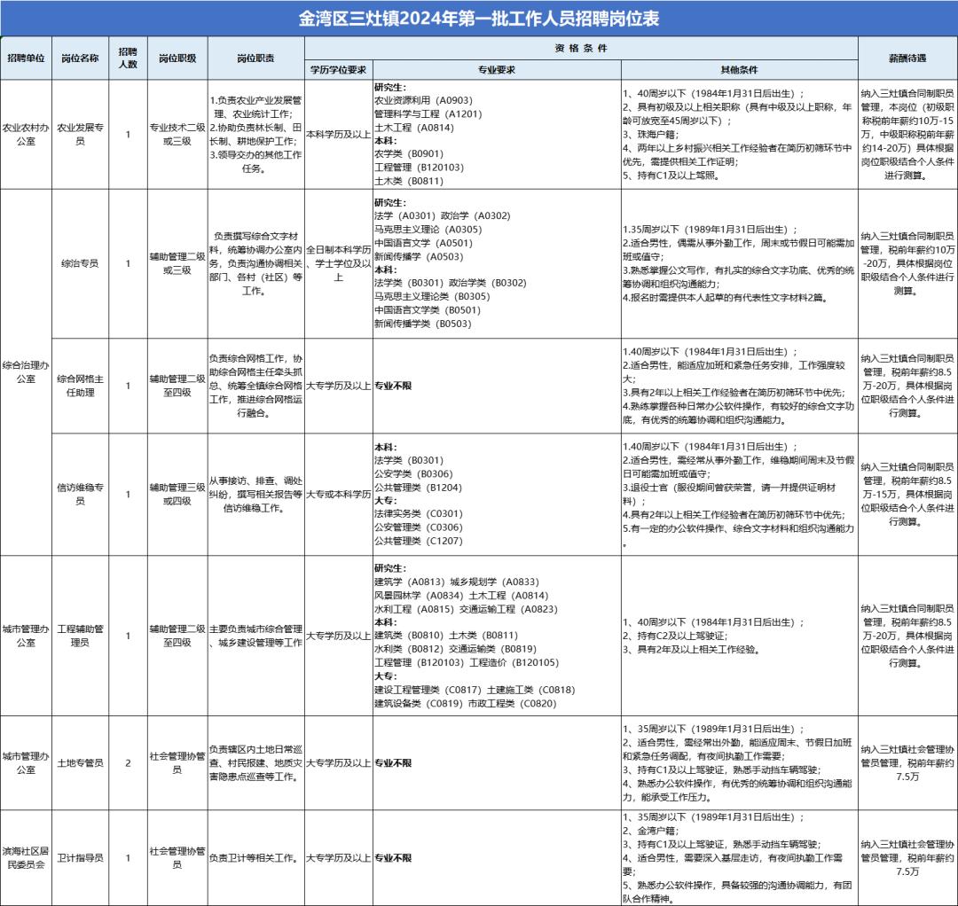 获聘人员为三灶镇属合同制职员或社会管理协管员,岗位所对应薪酬待遇详见上方岗位表。