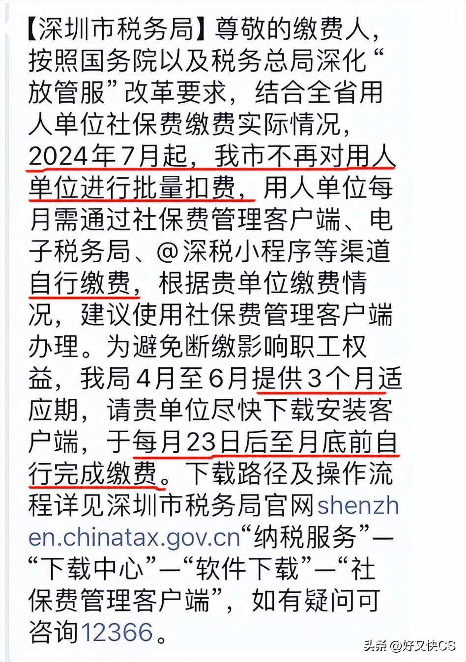 【深圳市税务局】尊敬的缴费人((深圳)有限公司),按照国务院以及税务总局深化“放管服”改革要求,结合全省用人单位社保费缴费实际情况,2024年7月起,我市不再对用人单位进行批量扣费,用人单位每月需通过社保费管理客户端、电子税务局、@深税小程序等渠道自行缴费,根据贵单位缴费情况,建议使用社保费管理客户端办理。为避免断缴影响职工权益,我局4月至6月提供3个月适应期,请贵单位尽快下载安装客户端,于每月23日后至月底前自行完成缴费。
