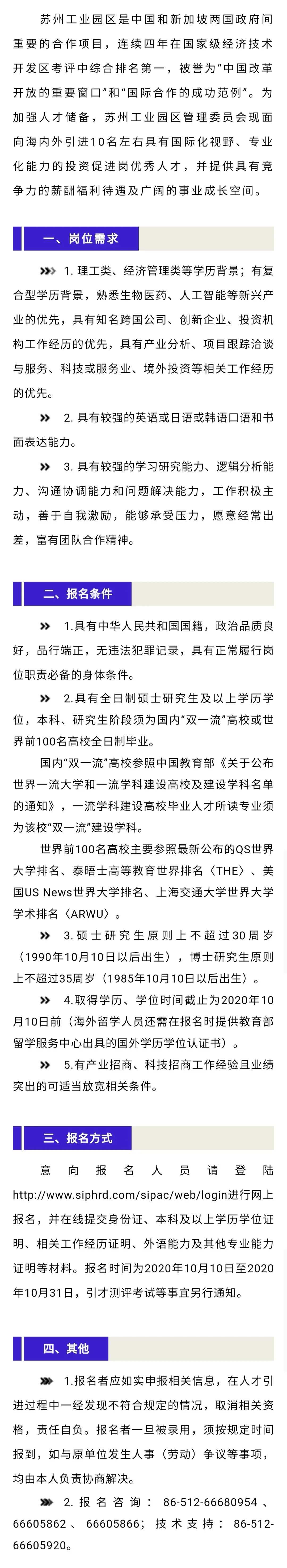苏州工业园区管理委员会现面向海内外引进10名左右具有国际化视野、专业化能力的投资促进岗优秀人才。意向报名人员请登陆网站进行网上报名,并在线提交相关材料。报名时间为2020年10月10日至2020年10月31日,引才测评考试等事宜另行通知。