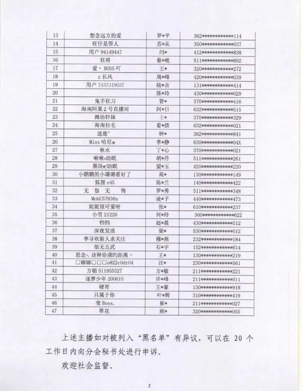 中国演出行业协会网络表演(直播)分会透露,根据《互联网文化管理暂行规定》《网络表演经营活动管理办法》《互联网直播服务管理规定》等相关法律法规,按照《网络表演(直播)行业主播“黑名单”管理制度》《黑名单认定工作流程》规定,向社会公布第七批主播黑名单,47名被列入黑名单的主播将在行业内禁止注册和直播,封禁期限5年。