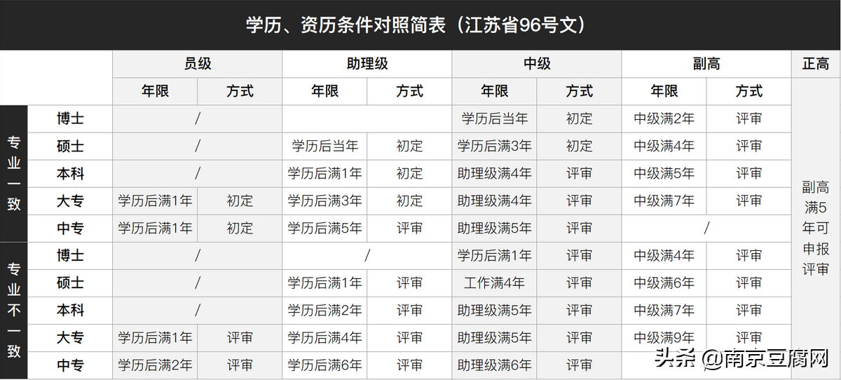 学历要求不同以《江苏省职称96号文》举例,我们可以看到,可以参加中级初定的有博士和硕士,本科和专科想评中级只能参加评审;助理工程师只有本科和专科可以参加初定,中专只能参加评审。