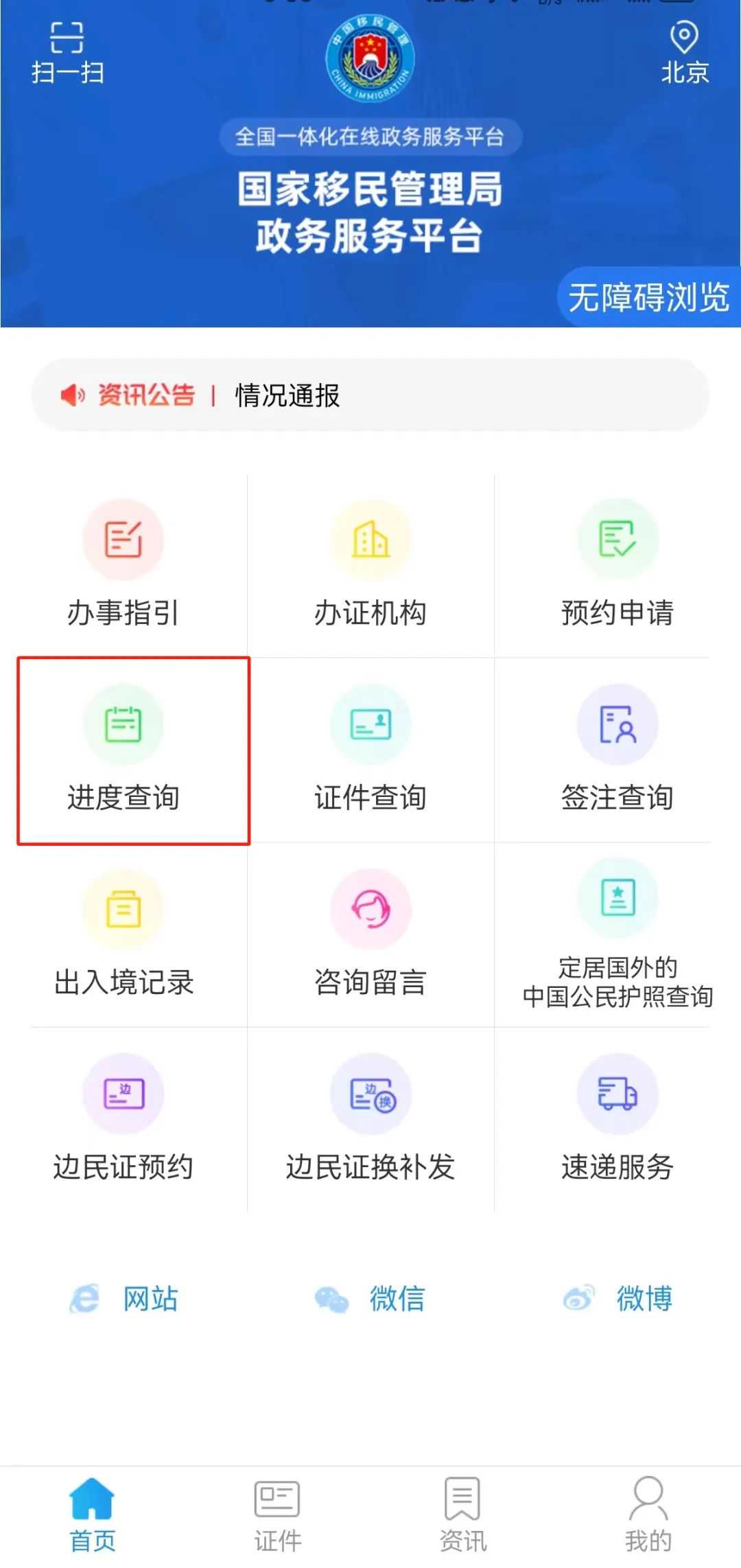 您可通过“移民局”App、“国家移民管理局政务服务平台”网站、12367服务热线、“移民局”小程序(微信、支付宝)、办证地公安出入境管理部门官方微信公众号等渠道,在线查询本人在境内公安出入境管理部门申办的普通护照、往来港澳通行证、往来台湾通行证、赴港澳台签注等证件办理进度。