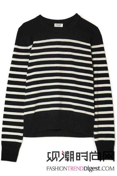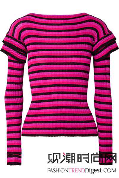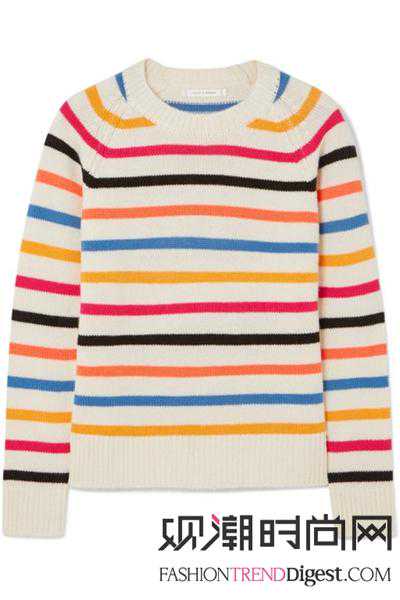 这款带有品牌经典法式条纹的毛衣,本季便以色彩纷呈的玫粉色、橙色、黄色和蓝色调令人不忍移目。它采用中等厚度的羊绒面料制成,并配有粗罗纹针织边饰。