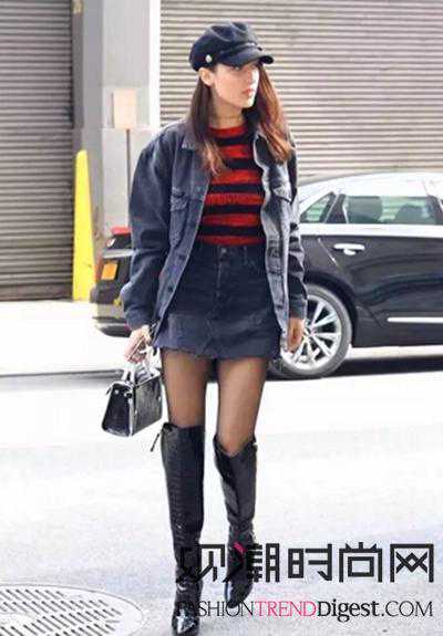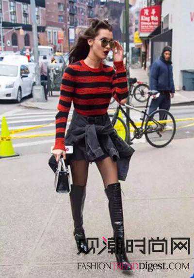 黑色和红色组合的条纹毛衣,这种撞色带着酷酷的感觉,搭配迷你短裙和漆皮长靴,超级chic。
