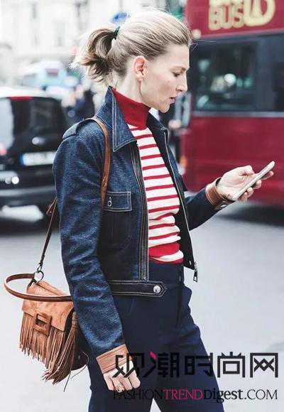 红色高领口的条纹毛衣搭配纯色牛仔外套,显得活泼而有型,条纹元素在里,纯色牛仔在外,这种层次感立刻让条纹显得更加活跃,完美搭配你也可以尝试。