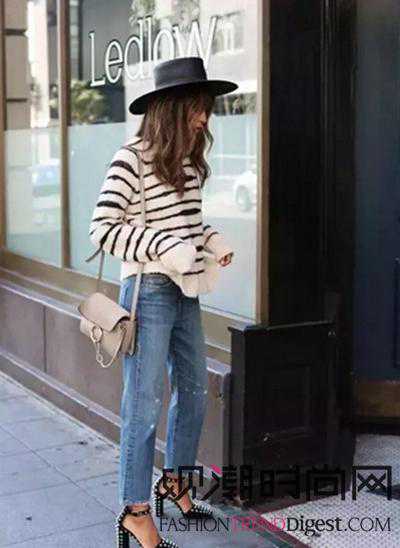 黑白条纹毛衣搭配牛仔裤街头风格十足,帅气又利落。