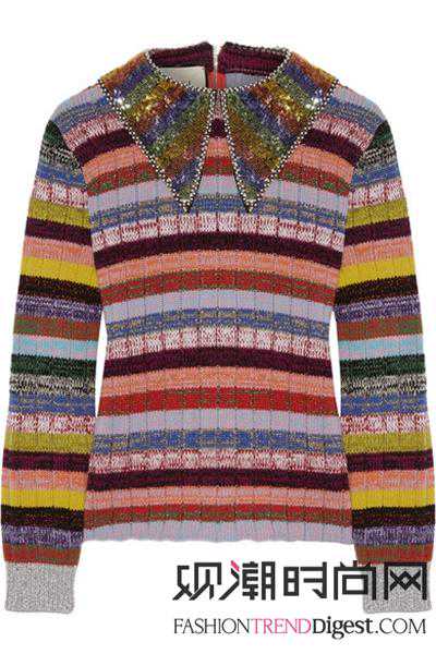 这款条纹毛衣采用柔软羊毛混纺线织就,其中两种颜色扭结混成一股,呈现出五彩斑斓的混色效果。镶满虹彩亮片和迷你人造珍珠的领口是整体设计的点睛之笔。